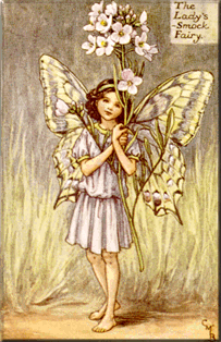 | Where the grass is damp and green, Where the shallow streams are flowing, Where the cowslip buds are showing, I am seen. Dainty as a fairy's frock, White or mauve, of elfin sewing, 'Tis the meadow-maiden growing-- Lady's-smock. |